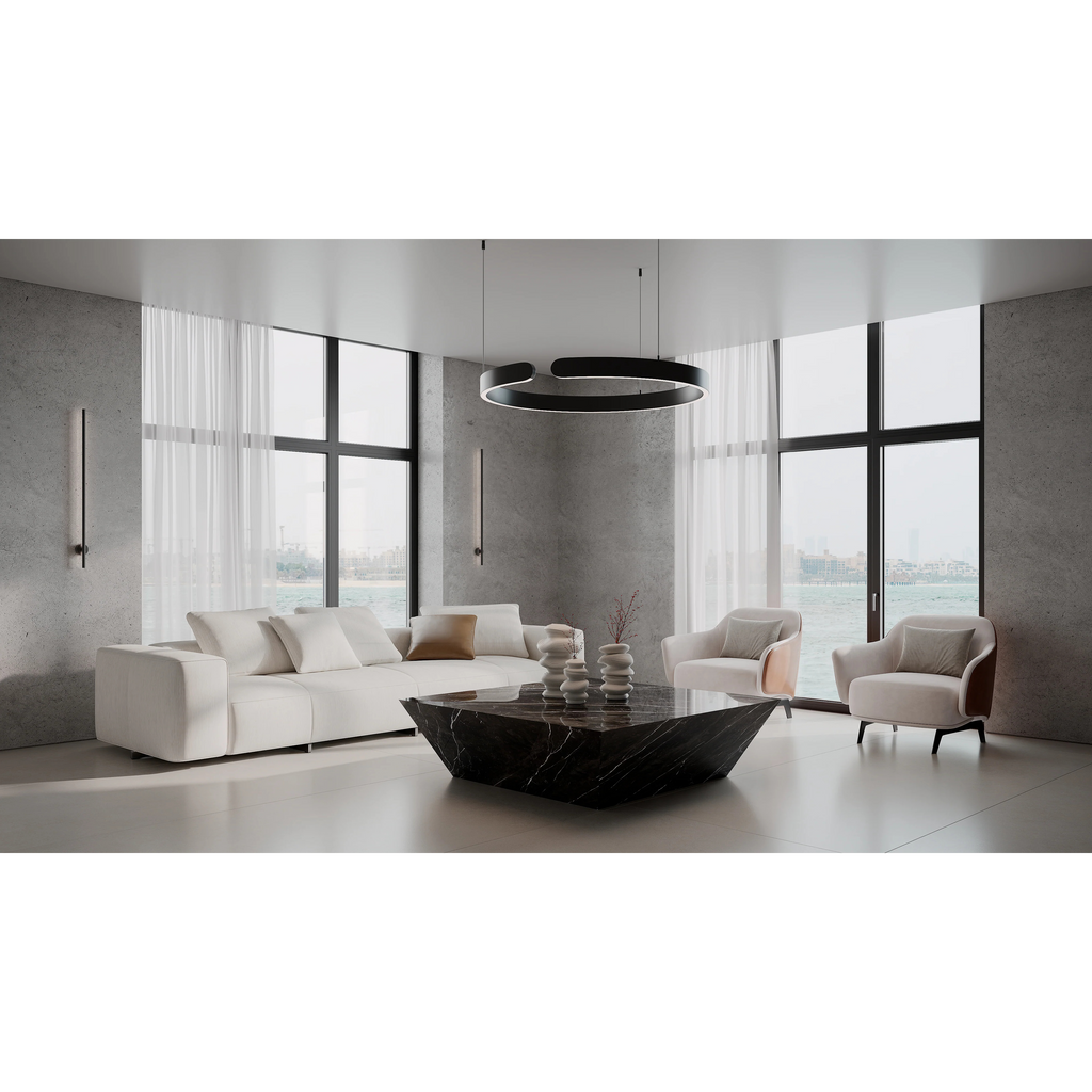 Nero Marquina is a bold, contemporary interpretation of classic marble — striking, sophisticated, and timeless. A deep black base is defined by clean white veining, creating powerful contrast and architectural presence. This finish pairs beautifully with modern monochromes, rich textures, and ambient lighting. Whether styled in a minimalist space or a dramatic statement setting, Nero Marquina commands attention with refined confidence. Each table is finished by hand in our Greenwich studio, highlighting the porcelain’s natural veining and depth. Crafted to endure, this piece embodies strength, balance, and modern luxury.